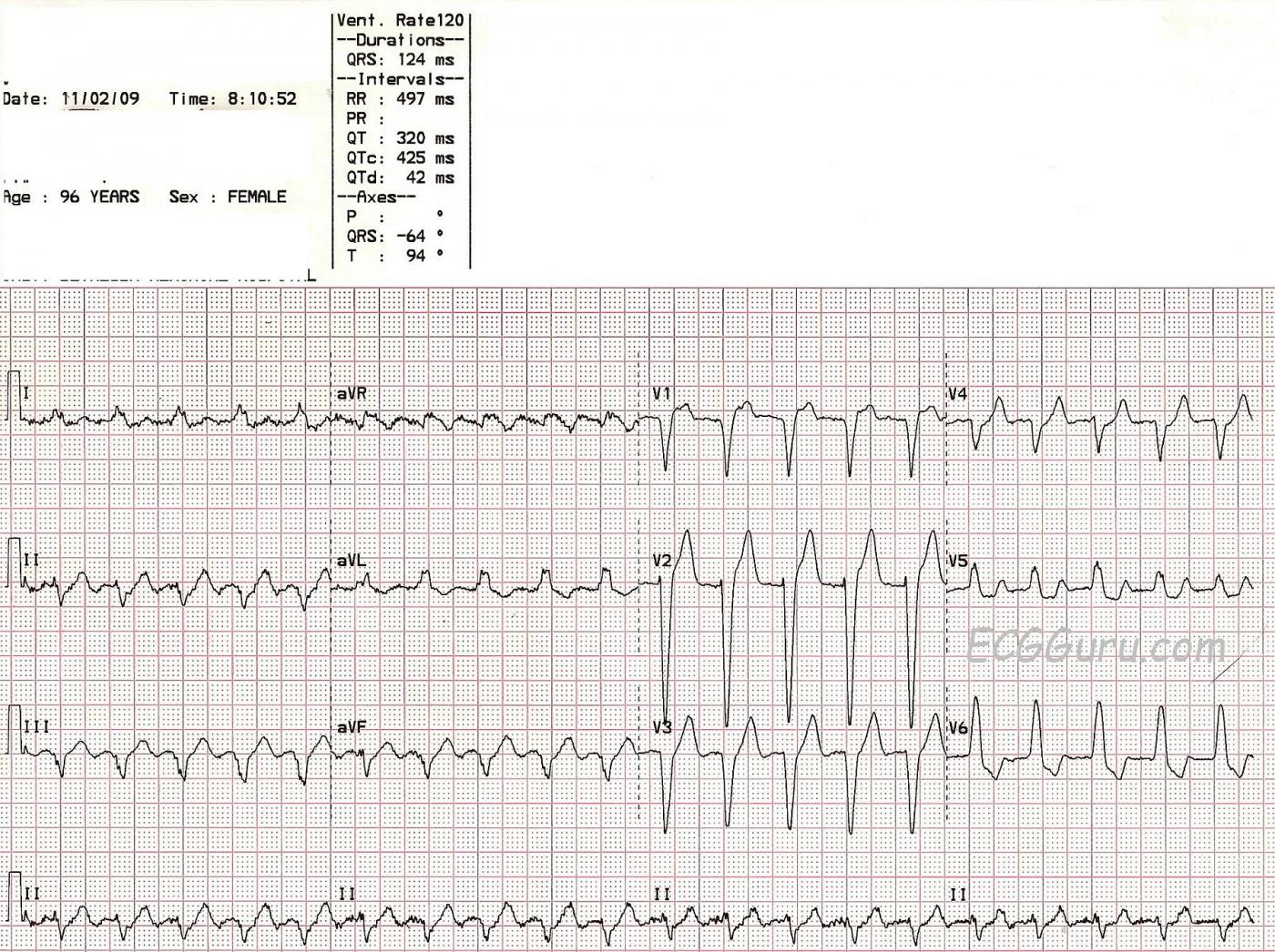 This ECG is a two-for-one teaching opportunity. This elderly woman presents with a tachycardia at about 120/min. We do not have any other information about her complaints or past medical history.
