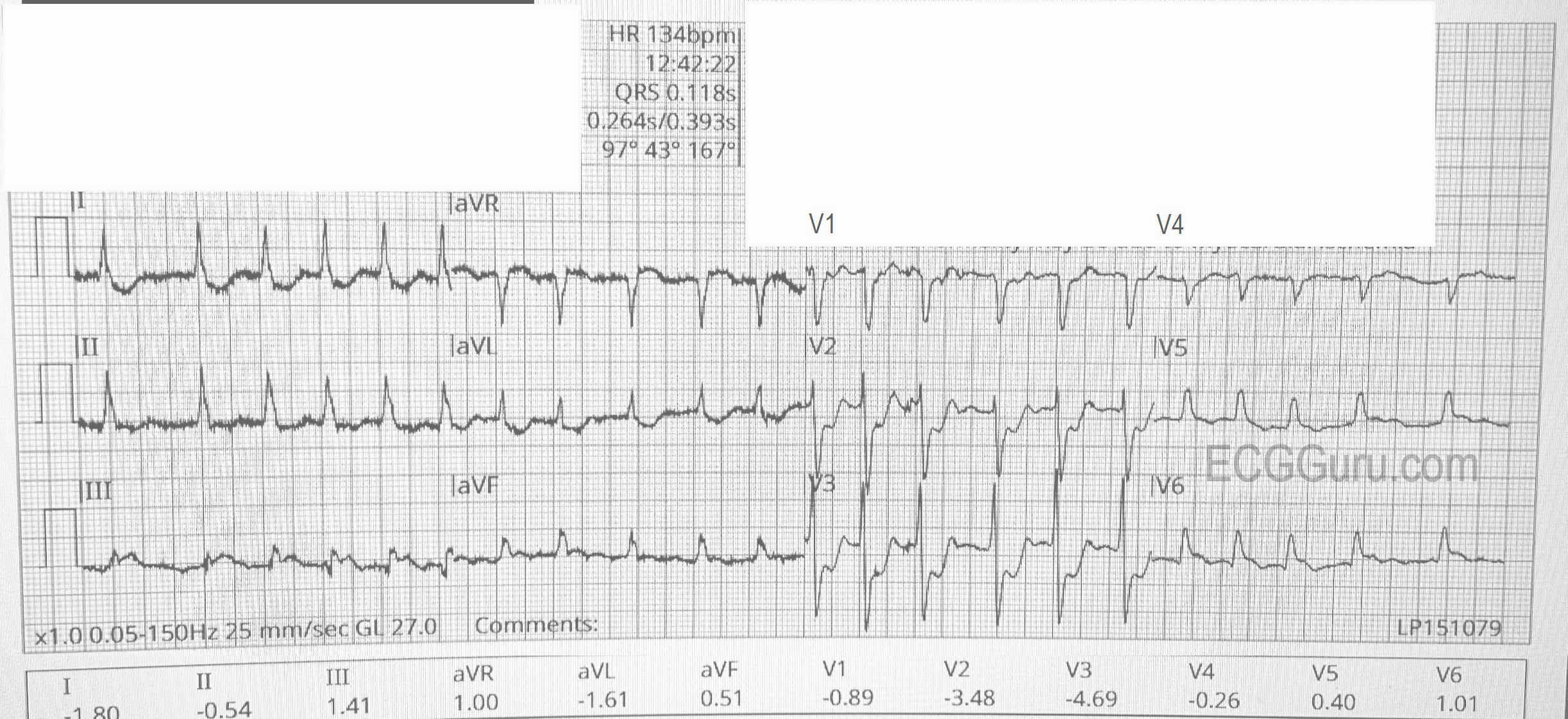 The rhythm is atrial fibrillation with a rapid ventricular response (about 134/min.). The QRS width is .118 seconds (118 ms).The frontal plane axis is slightly to the left, but WNL. The R wave progression mostly normal, but V4 is incongruous. V2 and V3 have a tall R wave, possibly representing a pathological Q on the posterior side.There are ST CHANGES in every lead. ST elevation is noted in III, aVF, aVR, V5 and V6, representing ischemia in the inferior wall. There is ST depression in all other leads, indicating widespread subendocardial ischemia and/or acute reciprocal depression.Interesting that Lead II would normally be elevated when III and aVF are, but aVR is elevated, causing reciprocal ST depression in Lead II.So, Lead II looks almost normal.