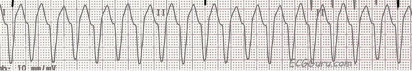 V tach is identified by: wide QRS complexes (>.12 seconds), rate faster than 100 bpm. In MONOMORPHIC V tach, all QRS complexes look alike. There are other mechanisms of wide-complex tachycardia, but they can be difficult to differentiate from a single rhythm strip. All WCT should be treated as V tach until proven otherwise.