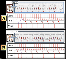 — As per Dawn, after beat #3 in Panel A — None of the P waves conduct. The way we know this — is that although the narrow-QRS ventricular rhythm is perfectly regular after beat #3 (at a rate of ~55/minute) — the PR interval continually changes (If you focus on each PINK arrow P wave before the QRS of beats #4, 5, 6, 7, 8 and 9 — you'll note a small-but-definitely-present continual change in the PR interval). This means that there is complete AV dissociation — because after beat #3, none of the P waves conduct! I suspect this represents complete AV block — although additional monitoring would be needed to confirm this. As an advanced Point — it is difficult to guarantee that all P waves fail to conduct despite adequate opportunity to conduct, because the ventricular rate is faster than 50/minute and because the atrial rate is so fast (See Blog #202).