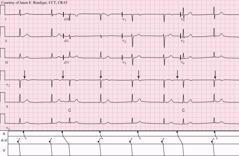 Once your students have mastered the basic rhythms and their criteria, many of them will want to try more challenging rhythms. Non-conducted premature beats, retrograde conduction, AV blocks, and concealed conduction can be easily explained using LADDERGRAMS. A laddergram is a diagram of a rhythm strip showing the timing and conduction of the electrical impulses. There is a line drawn for the atrial activity, one for ventricular activity, and one for AV activity. Blocks and retrograde conduction can be easily shown
