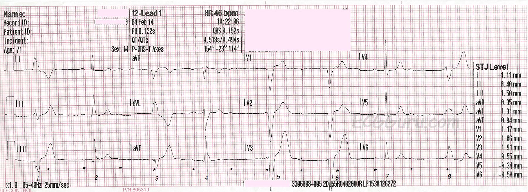 Paramedic Erik Testerman has generously donated several excellent teaching ECGs to the Guru, and we will be featuring all of them soon. This week, we show you the ECGs from a 59-year-old man with a blood glucose of 30 mg/dl. He had no complaints . After a bolus of Dextrose 10%, his blood glucose was 105 mg/dl. He gave a past medical history of diabetes mellitus, hypertension, and left bundle branch block. Vitals were reported as normal and stable, except for the slow heart rate.