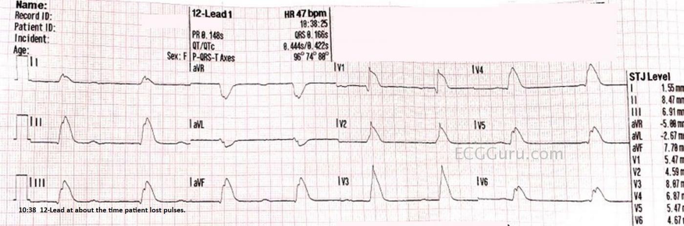 She was immediately ventilated and intubated, and an intraosseous infusion line established. A12-lead ECG was done, and it showed a dramatic change in the rhythm and ST segments over the initial strip. She was transported to a nearby hospital with CPR support. She achieved return of spontaneous circulation (ROSC) at the Emergency Department, after having three doses of epinephrine. Follow up with the ED physician revealed that the patient had suffered a massive gastrointestinal bleed. This patient, due to loss of a critical amount of blood, had low blood pressure and very poor perfusion, which resulted in damage to her heart (and possibly other organs as well). I do not have further follow up, but will update this if I receive more information.