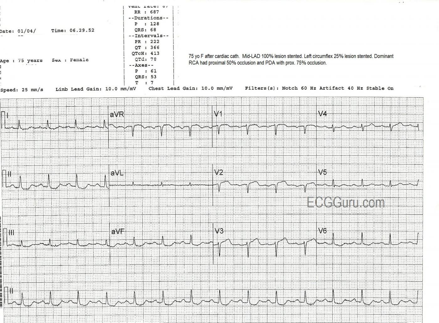 The patient was taken to the cath lab, where it was found that she had a 100% mid-left anterior descending artery occlusion, which was opened and stented. She also was found to have widespread coronary artery disease, with the left circumflex artery 25% occluded (stented), the right coronary artery (which was dominant) proximately occluded 50% and stented, and the posterior descending artery 75% occluded (stented).